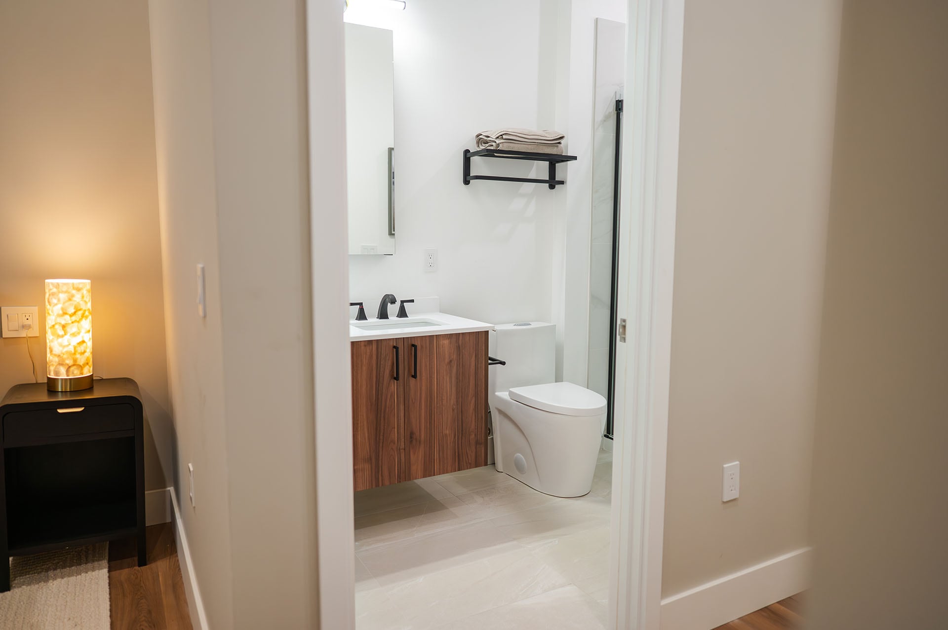 - Floating modern vanities in all bathrooms with storage